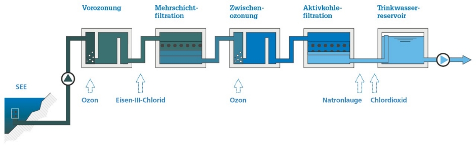 - Zwischenoxidation mit Ozon (Abtöten der Mikroorganismen, Abbau von Schadstoffen)
